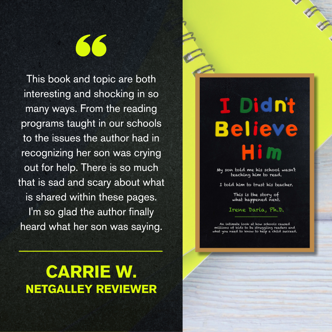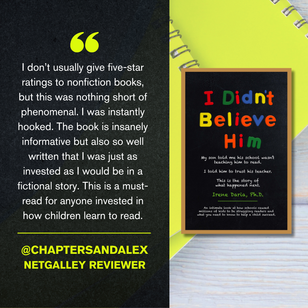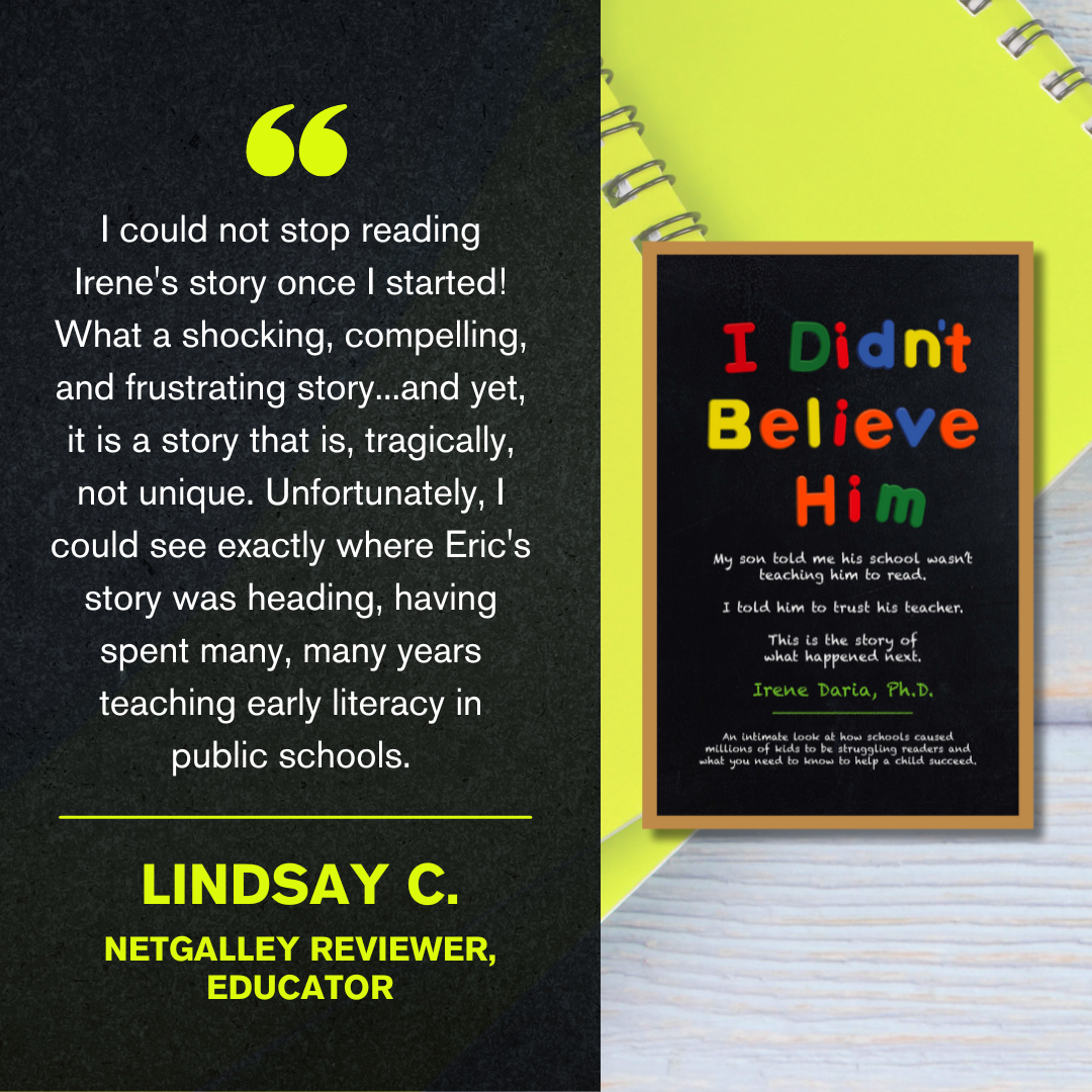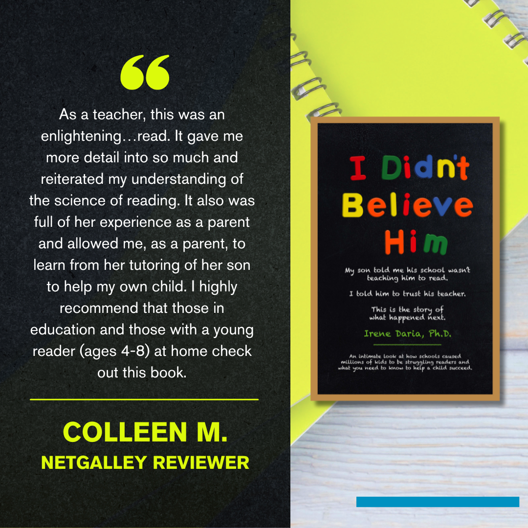 “It was such a pleasure to meet you last week. Last night, we pulled out one of the little phonics books you gave us and, well, my son was a superstar. He looked at me and said, `Mom! I can read!’ He was so excited and I was so proud. THANK YOU for already making a difference! How great that your workbooks will let other families follow the guidance you gave us!"